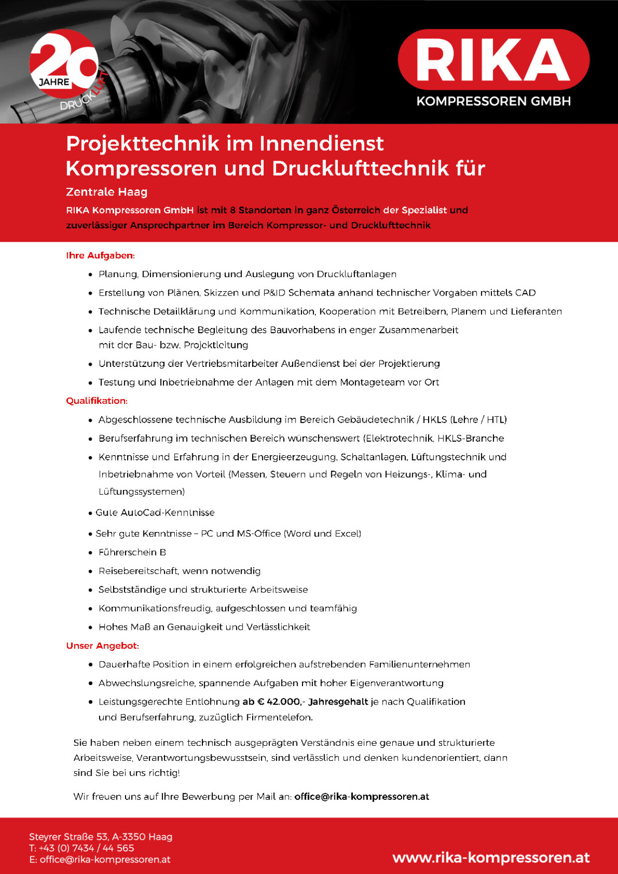 Leistungsgerechte Entlohnung ab € 42.000,- Jahresgehalt je nach Qualifikation und Berufserfahrung, zuzüglich Firmentelefon.